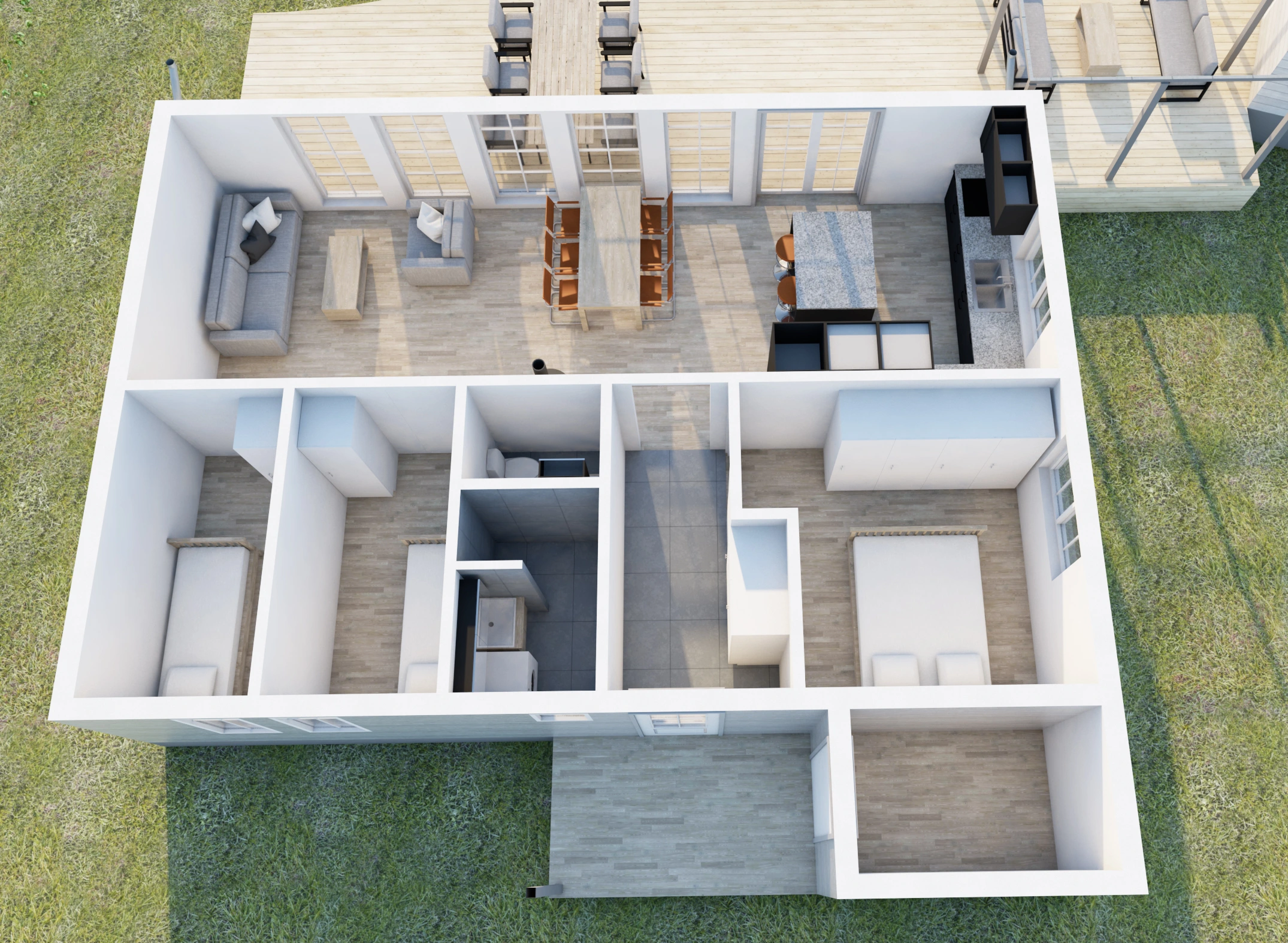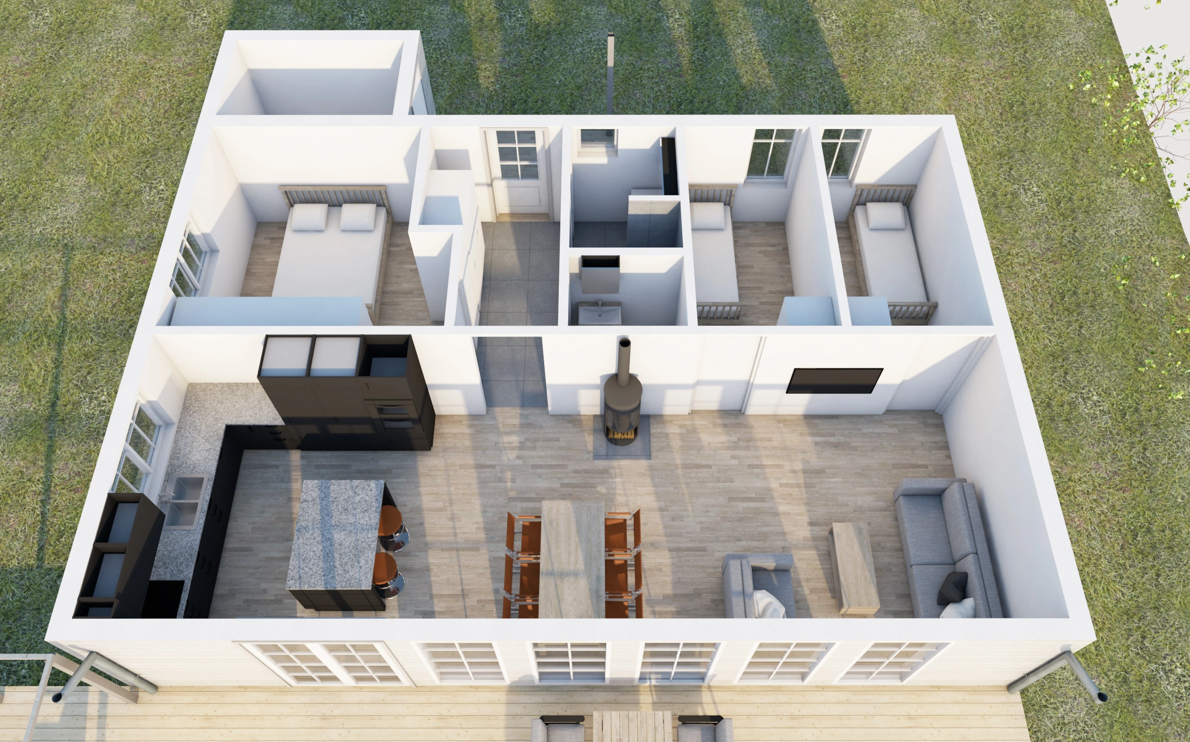 Ägarna hade precis köpt en avstyckad tomt och hörde av sig med önskemål på ritningar för ett nytt fritidshus. Tomten ligger granne med en stor äng och inte långt ifrån sjön. Det hela resulterade i ett lite större huvudhus med tre sovrum, dusch, wc, kök och vardagsrum samt ett externt gästhus med sovrum och bastu. Husen är placerade vinkelrätt mot varandra med en stor altan som binder dem samman.