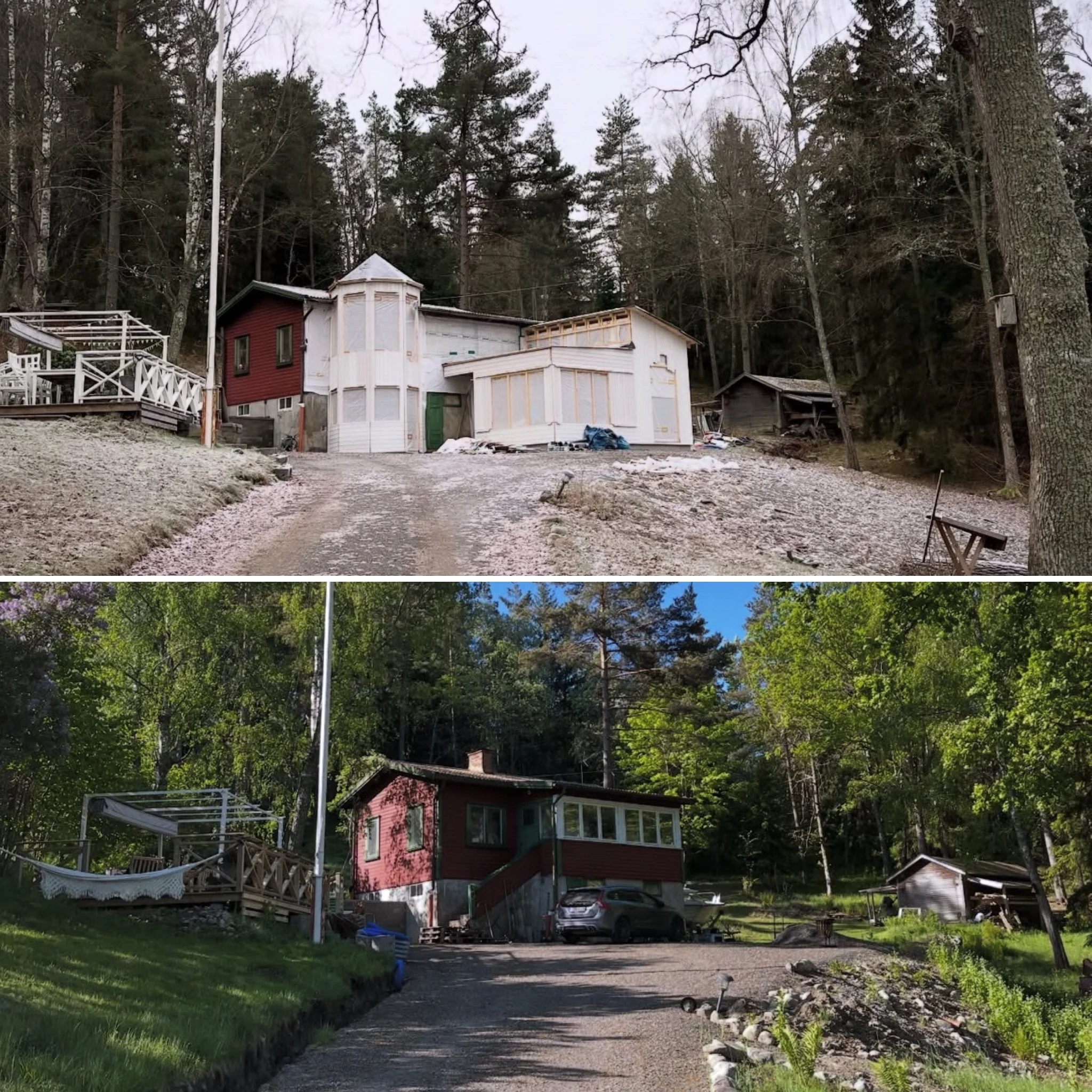 En tillbyggnad som ligger mig varmt om hjärtat. Starten på Koia faktiskt. En slump förde oss samman då vi hade liknande namn på våra instagramkonton. Paret hade tillbyggnadstankar och jag erbjöd mig att hjälpa till. Tornet har varit med från start men istället för att bygga upp mot slänten som var deras ursprungliga idé flyttade vi fokus till framsidan av huset och deras fantastiska vattenvy! Tornet fungerar nu som ett förråd i entréplan och passage till takterassen på övre plan där den tidigare entrén låg.